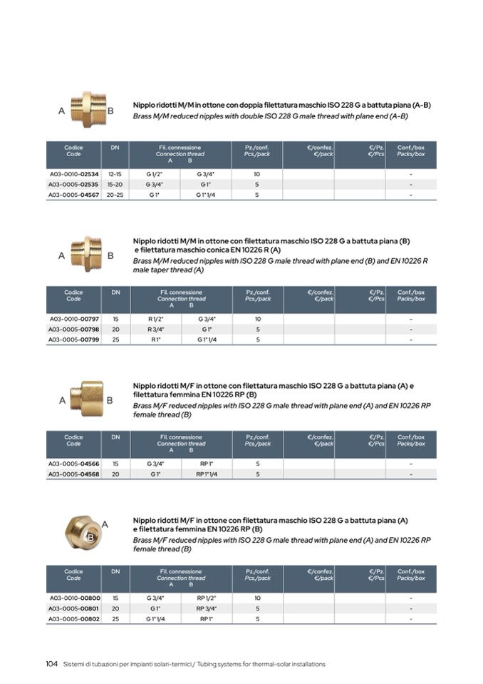 Brass M/F reduced nipples with ISO 228 G male thread with plane end (A) and EN 10226 RP
