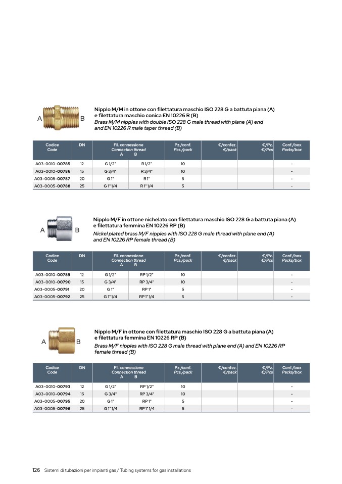 Brass M/F nipples with ISO 228 G male thread with plane end (A) and EN 10226 R