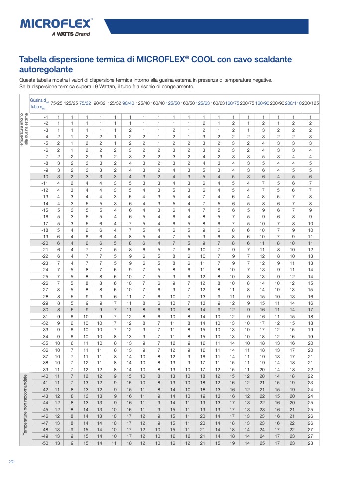 Questa tabella mostra i valori di dispersione termica intorno alla guaina esterna in presenza di temperature negative.