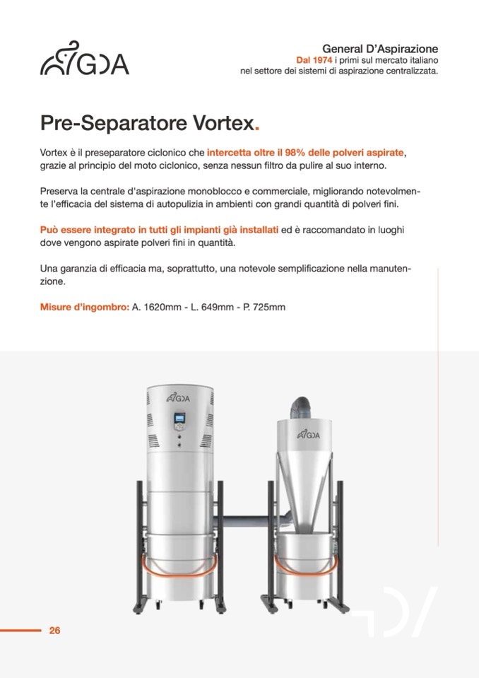 Vortex è il preseparatore ciclonico che intercetta oltre il 98% delle polveri aspirate,