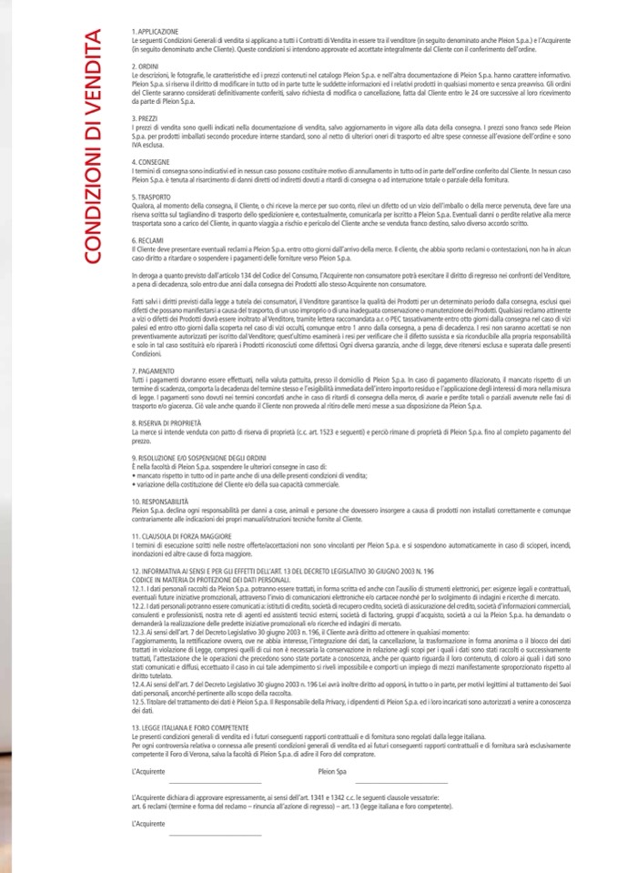 Le descrizioni, le fotografie, le caratteristiche ed i prezzi contenuti nel catalogo Pleion S.p.a. e nell’altra documentazione di Pleion S.p.a. hanno carattere informativo.
