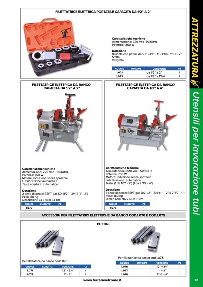ACCESSORI PER FILETTATRICI ELETTRICHE DA BANCO COD.1.070 E COD.1.075