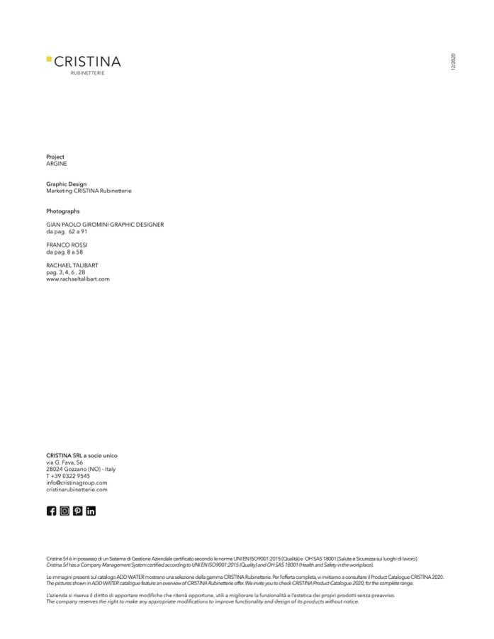 Le immagini presenti sul catalogo ADD WATER mostrano una selezione della gamma CRISTINA Rubinetterie. Per l’offerta completa, vi invitiamo a consultare il Product Catalogue CRISTINA 2020.