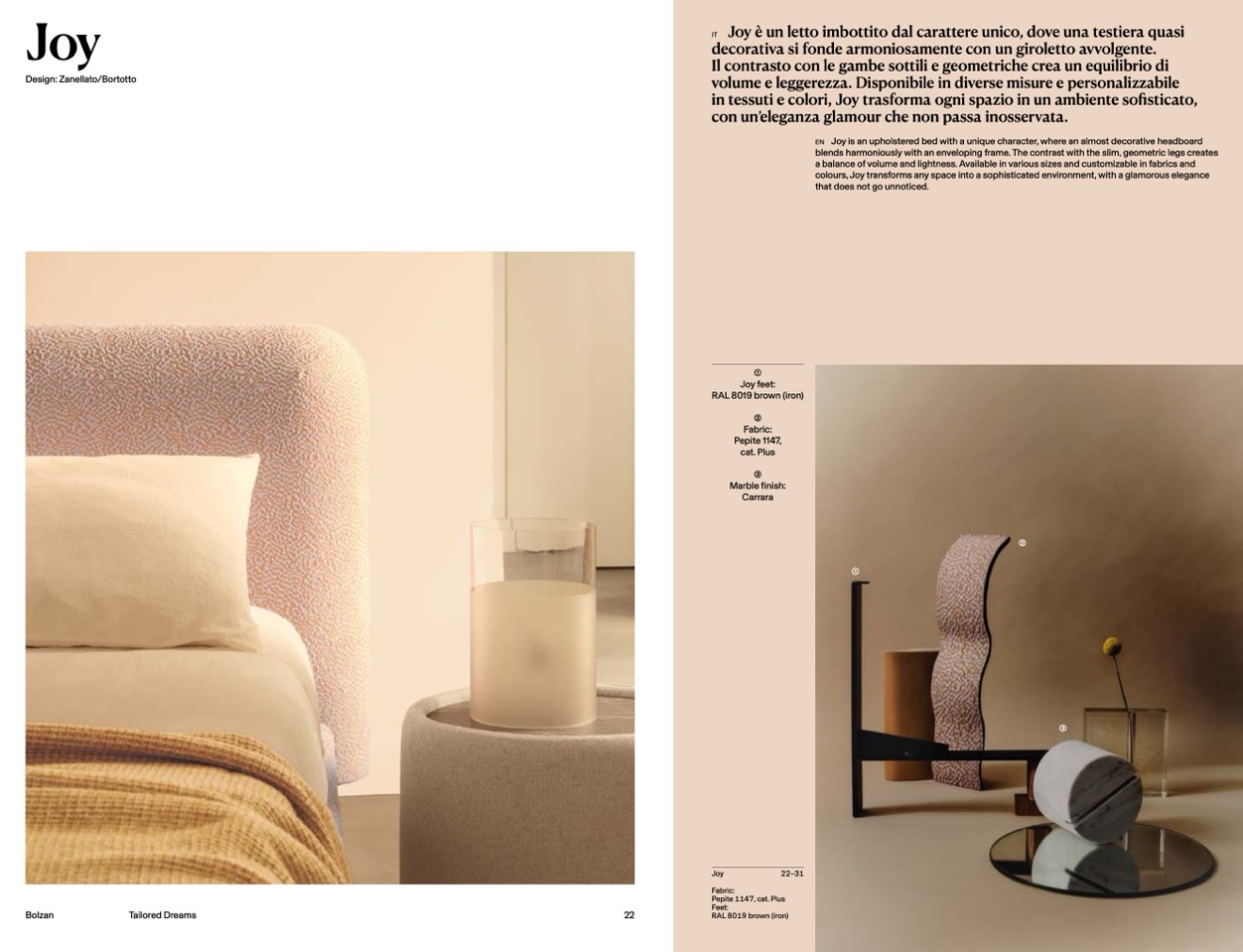Joy is an upholstered bed with a unique character, where an almost decorative headboard