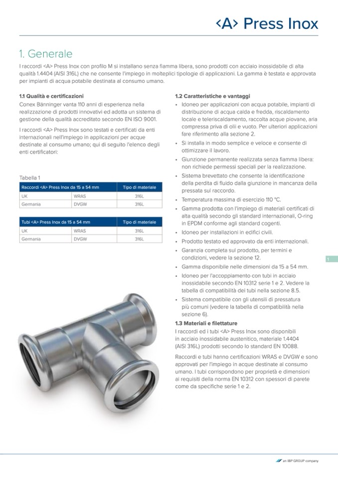 I raccordi <A> Press Inox con profilo M si installano senza fiamma libera, sono prodotti con acciaio inossidabile di alta