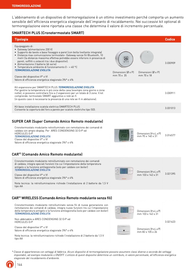 * Classe di appartenenza con settaggi di fabbrica. Alcuni dispositivi di termoregolazione possono assumere classi diverse a seconda dei settaggi
