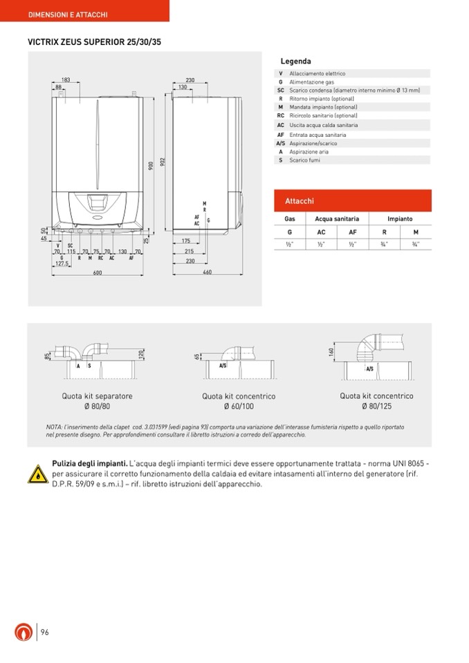 NOTA: l’inserimento della clapet cod. 3.031599 (vedi pagina 93) comporta una variazione dell’interasse fumisteria rispetto a quello riportato