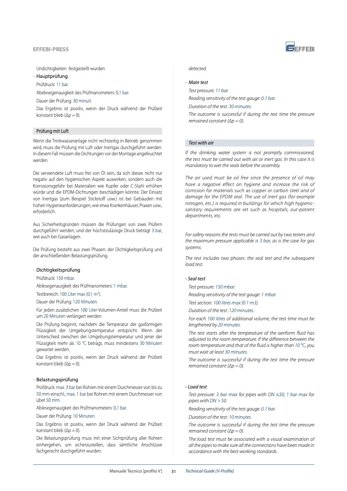 Prüfdruck: max. 3 bar bei Rohren mit einem Durchmesser von bis zu