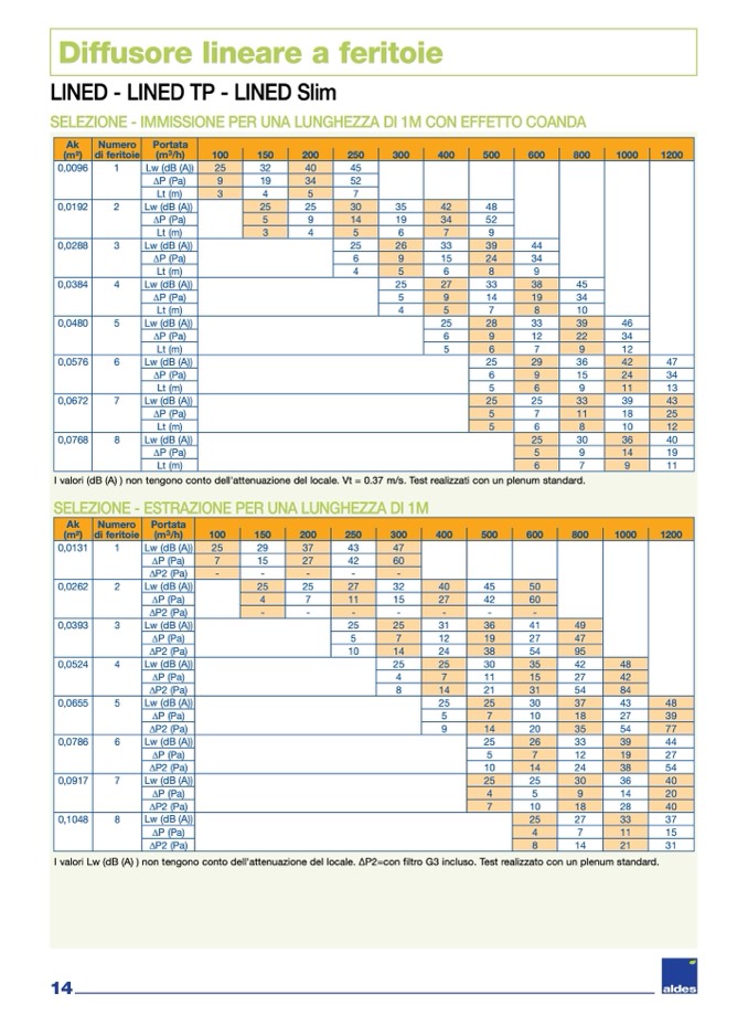 I valori (dB (A) ) non tengono conto dell'attenuazione del locale. Vt = 0.37 m/s. Test realizzati con un plenum standard.