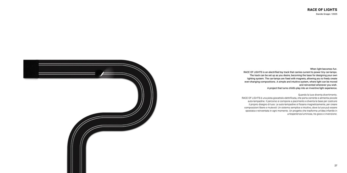 RACE OF LIGHTS is an electrified toy track that carries current to power tiny car-lamps.