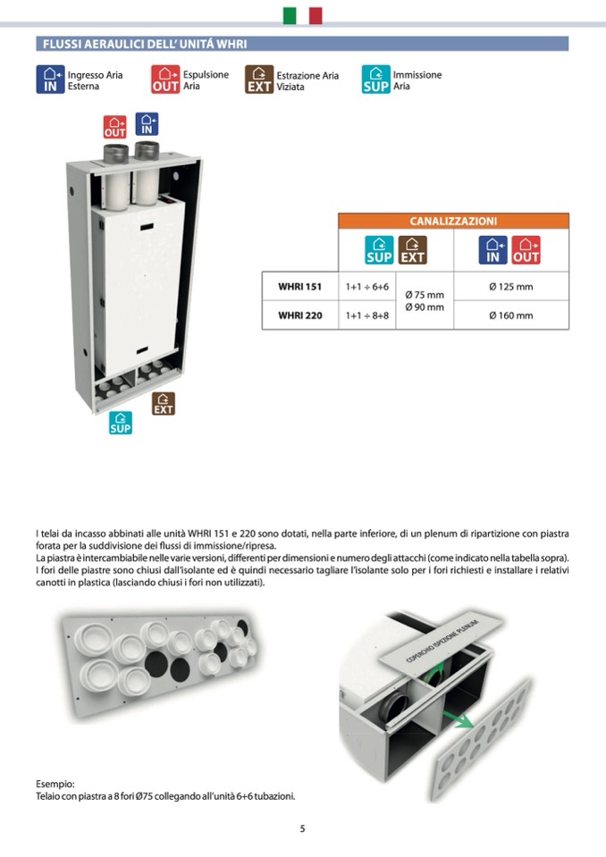 I telai da incasso abbinati alle unità WHRI 151 e 220 sono dotati, nella parte inferiore, di un plenum di ripartizione con piastr