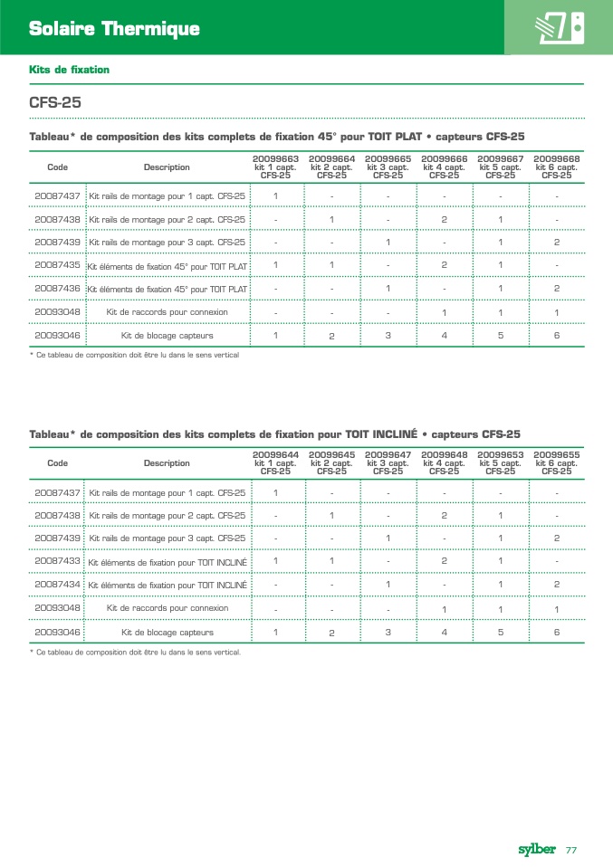 Tableau* de composition des kits complets de fixation pour TOIT INCLINÉ capteurs CFS-25