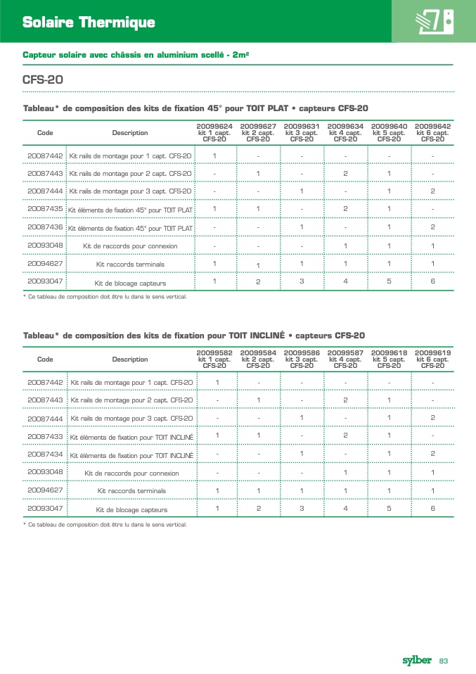 Tableau* de composition des kits de fixation pour TOIT INCLINÉ capteurs CFS-20