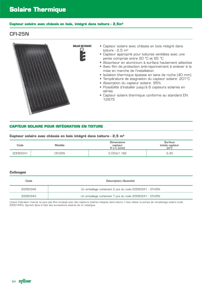 Capteur solaire avec châssis en bois, intégré dans toiture - 2,5m
