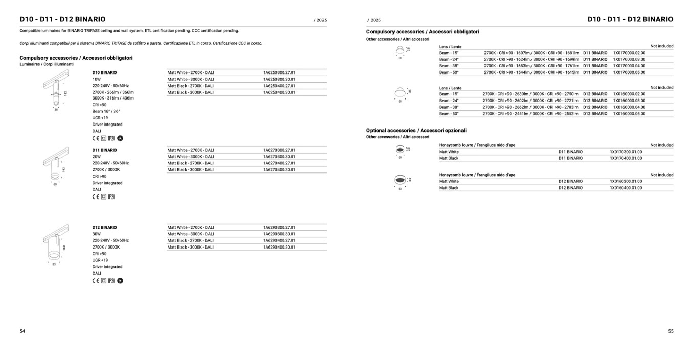 Compatible luminaires for BINARIO TRIFASE ceiling and wall system. ETL certification pending. CCC certi