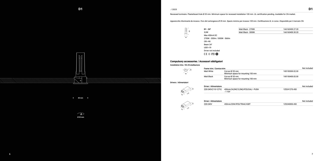 Recessed luminaire. Plasterboard hole Ø 35 mm. Minimum space for recessed installation 100 mm. UL certi