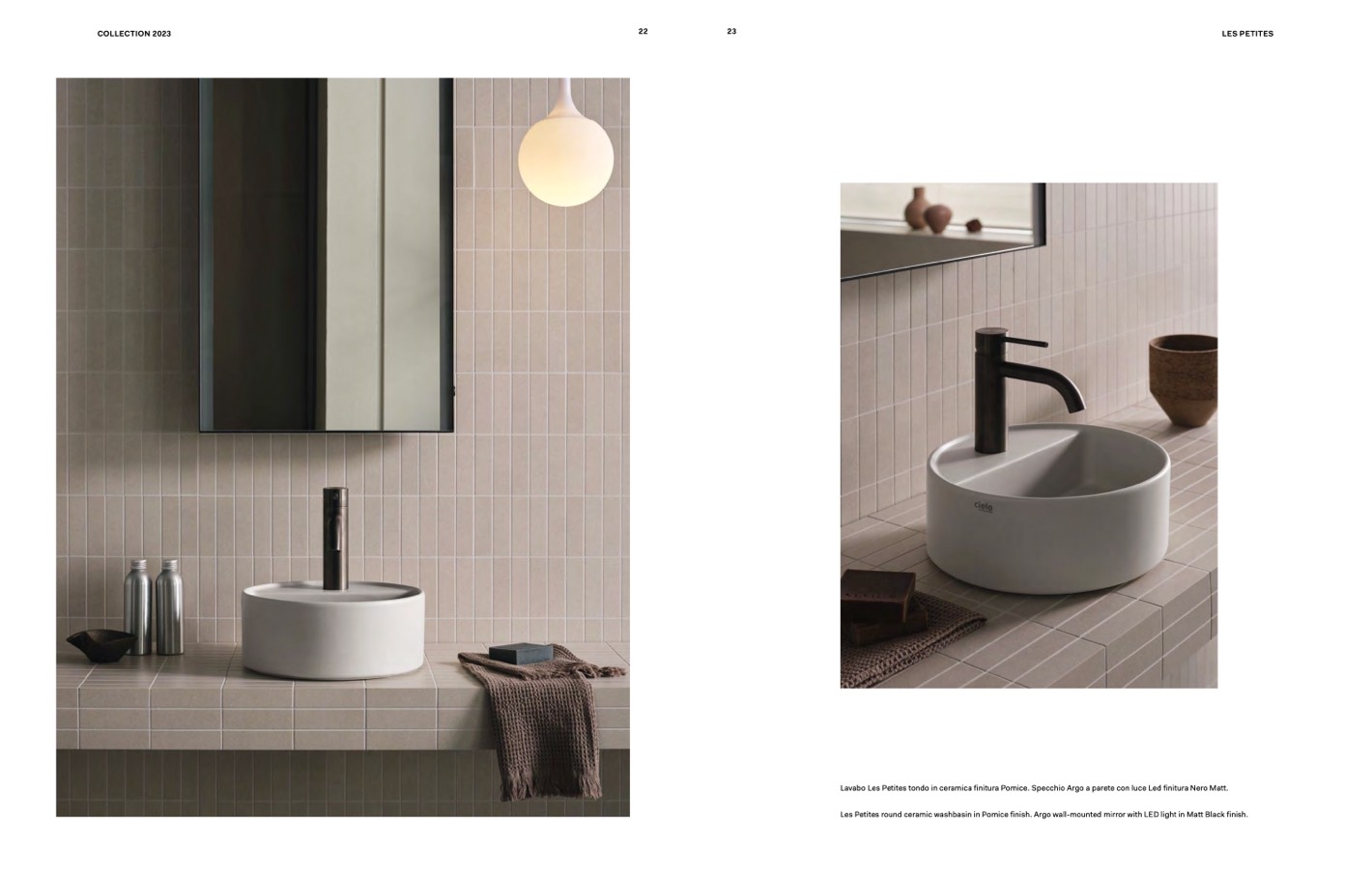 Les Petites round ceramic washbasin in Pomice finish. Argo wall-mounted mirror with LED light in Matt Black finish.