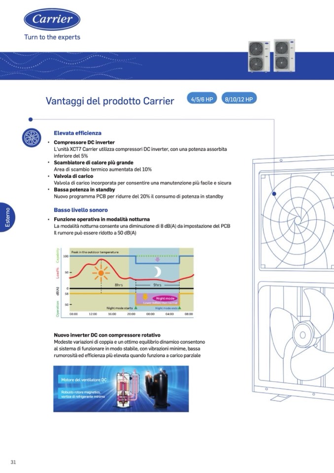 L'unità XCT7 Carrier utilizza compressori DC inverter, con una potenza assorbita