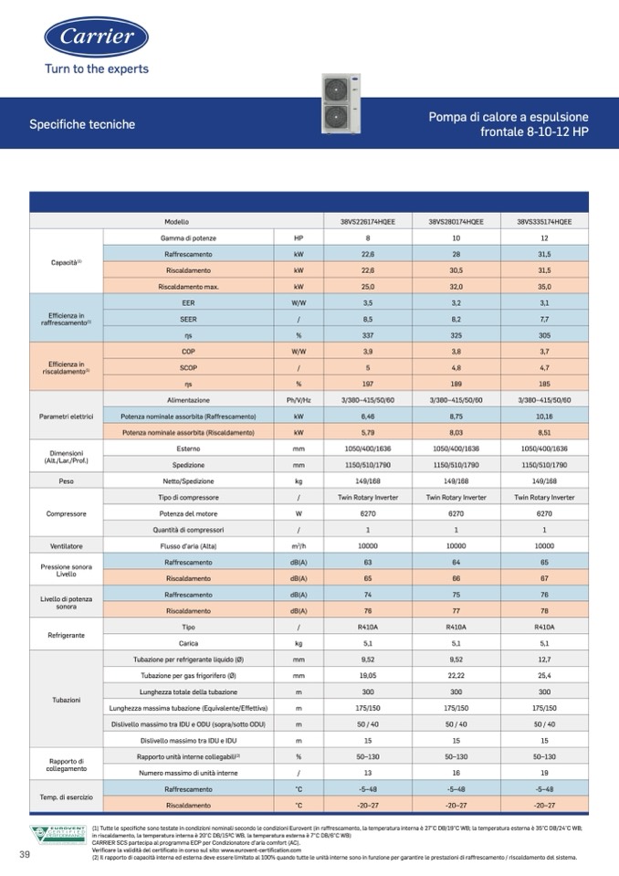 (1) Tutte le specifiche sono testate in condizioni nominali secondo le condizioni Eurovent (in raffrescamento, la temperatura interna è 27°C DB/19°C WB; la temperatura esterna è 35°C DB/24°C WB;