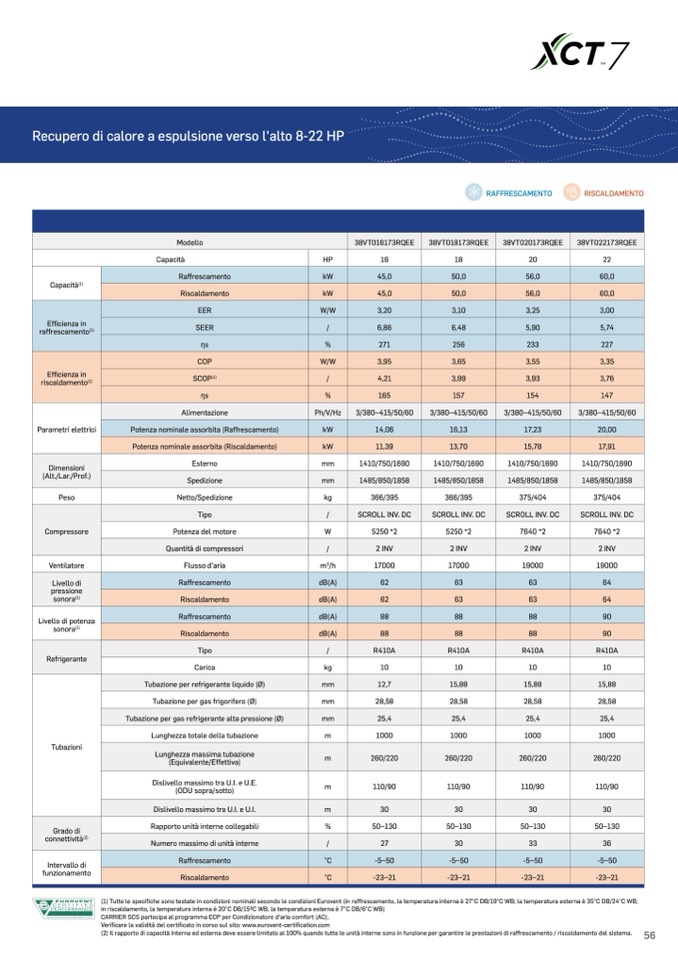 (1) Tutte le specifiche sono testate in condizioni nominali secondo le condizioni Eurovent (in raffrescamento, la temperatura interna è 27°C DB/19°C WB; la temperatura esterna è 35°C DB/24°C WB;