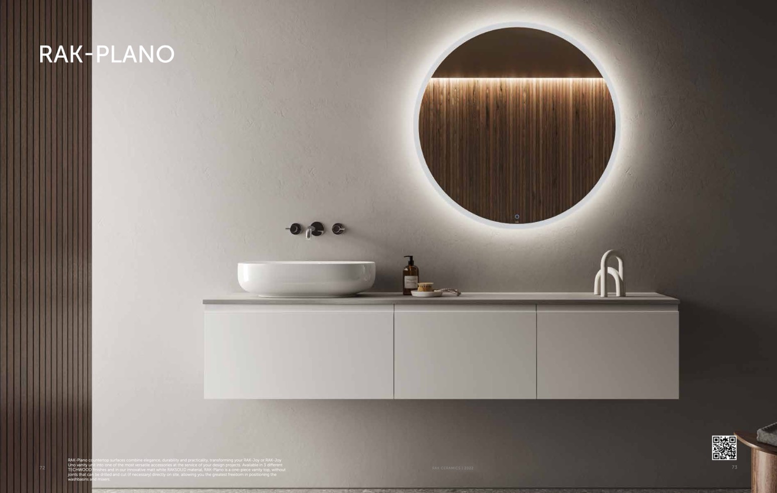 TECHWOOD finishes and in our innovative matt white RAKSOLID material, RAK-Plano is a one-piece vanity top, without