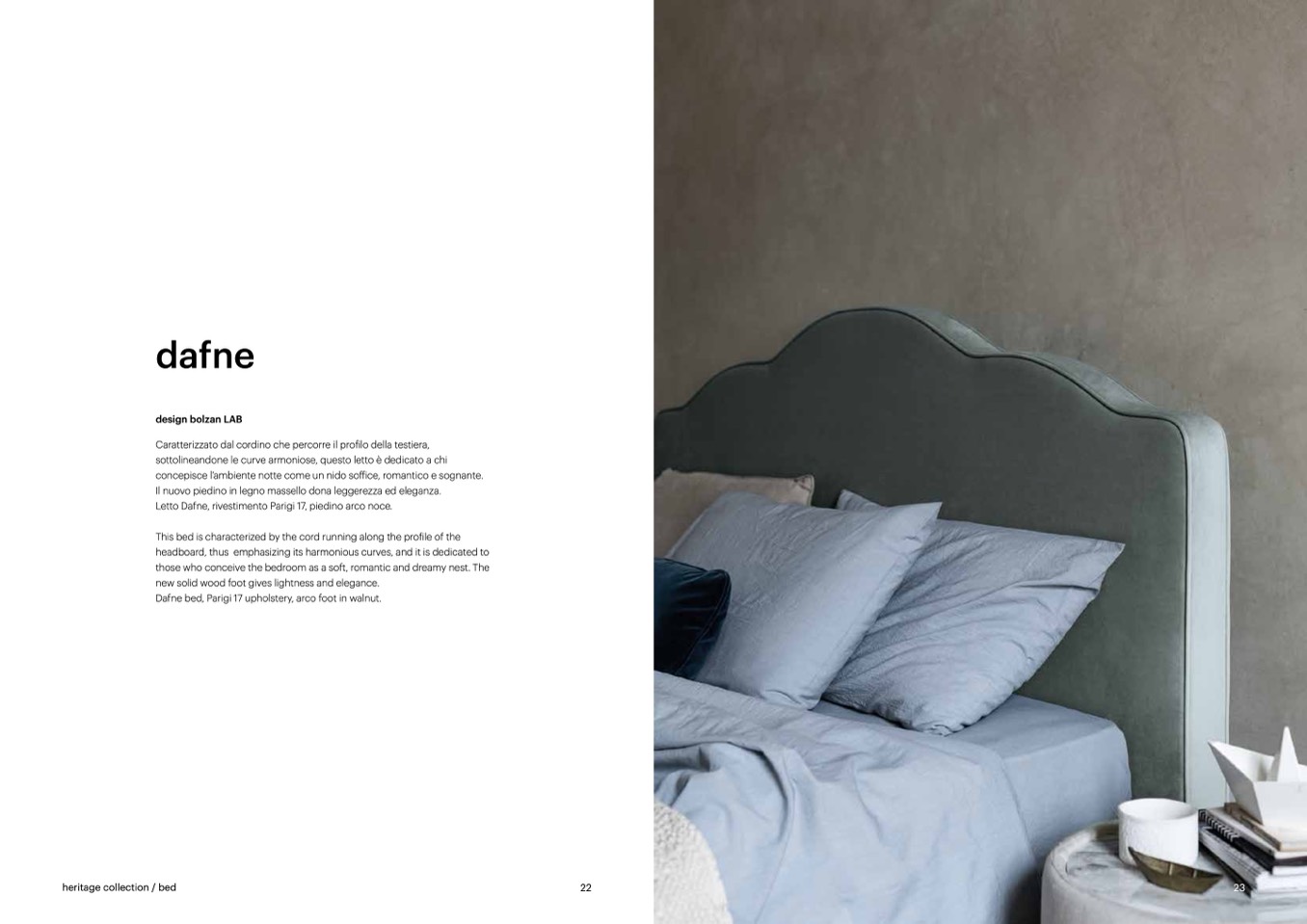 Dafne bed, Parigi 17 upholstery, arco foot in walnut.