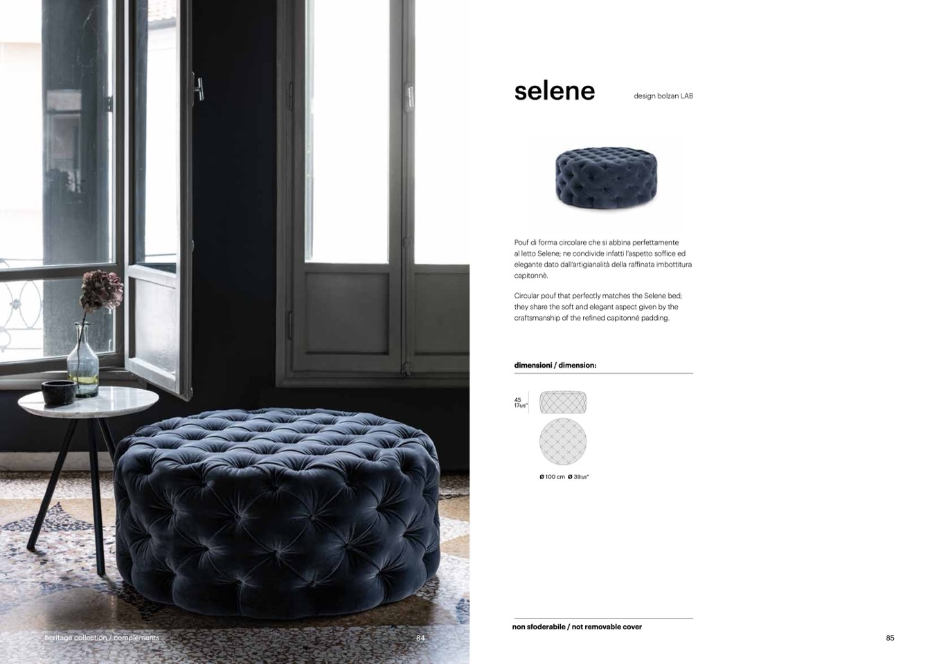 Circular pouf that perfectly matches the Selene bed;