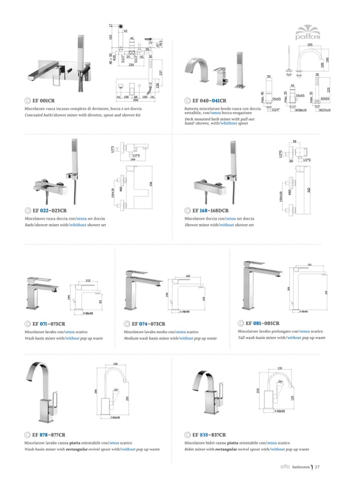 Bidet mixer with rectangular swivel spout with/without pop up waste