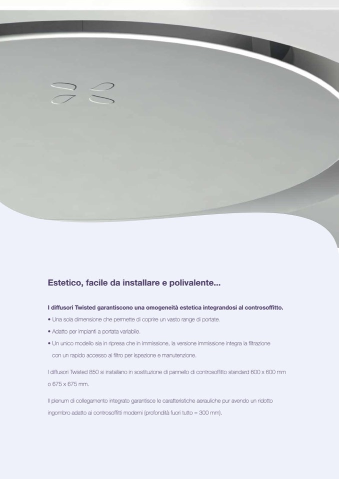 I diffusori Twisted 850 si installano in sostituzione di pannello di controsoffitto standard 600 x 600 mm