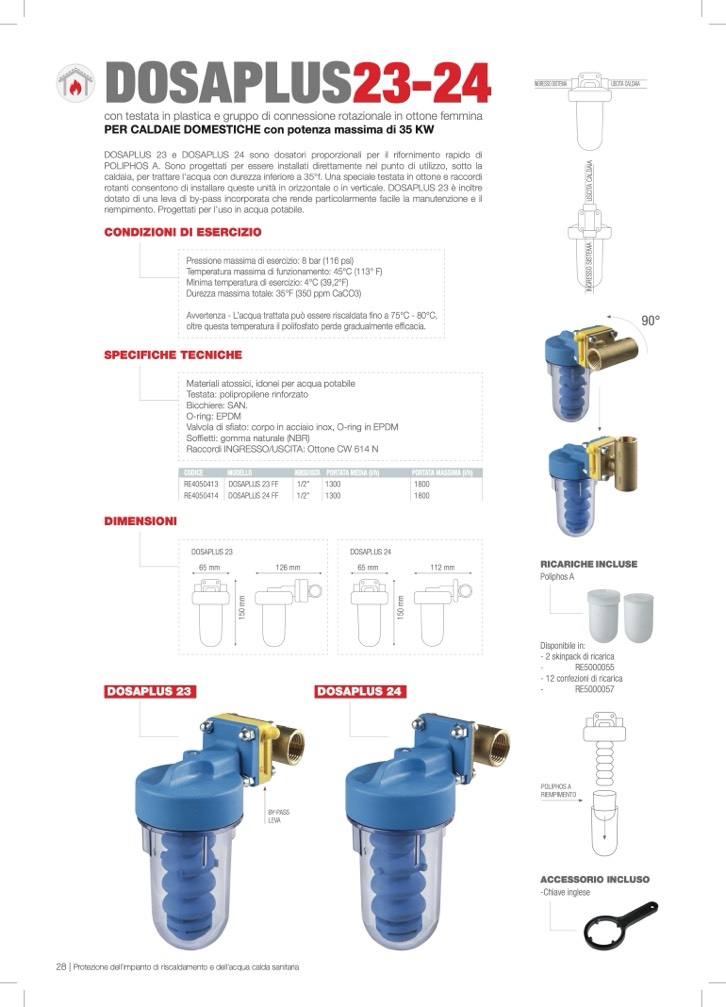 caldaia, per trattare l'acqua con durezza inferiore a 35°f. Una speciale testata in ottone e raccordi