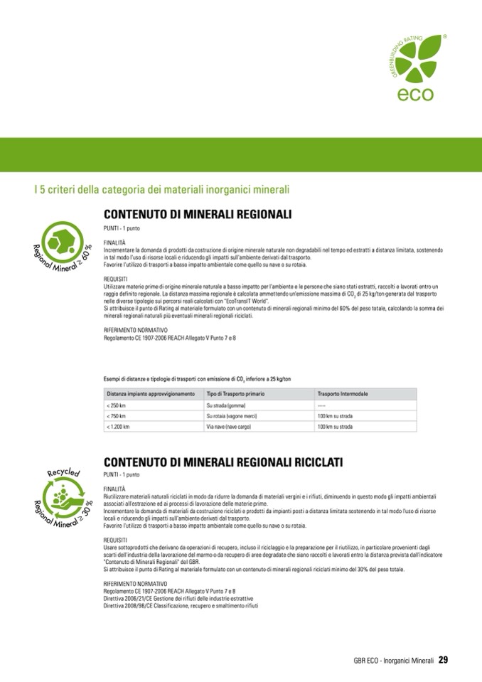 Si attribuisce il punto di Rating al materiale formulato con un contenuto di minerali regionali minimo del 60% del peso totale, calcolando la somma dei