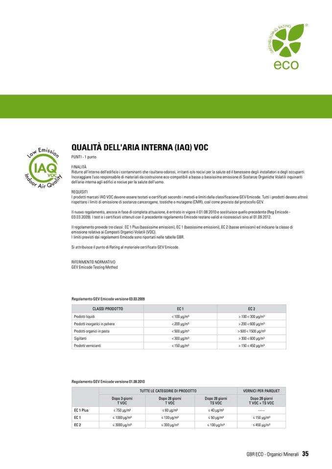 I prodotti marcati IAQ VOC devono essere testati e certificati secondo i metodi e limiti della classificazione GEV Emicode. Tutti i prodotti devono altresì