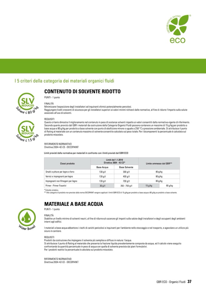 ** Alle categorie di prodotto non previste dalla norma DECOPAINT vengono applicati i limiti GBR ECO di 15 g/kg per prodotto a base acqua e 80 g/kg se prodotto a base solvente.