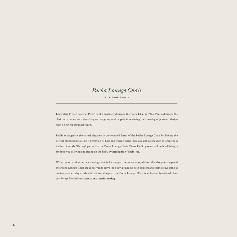 inclined inwards. Through pieces like the Pacha Lounge Chair, Pierre Paulin pioneered low-level living; a