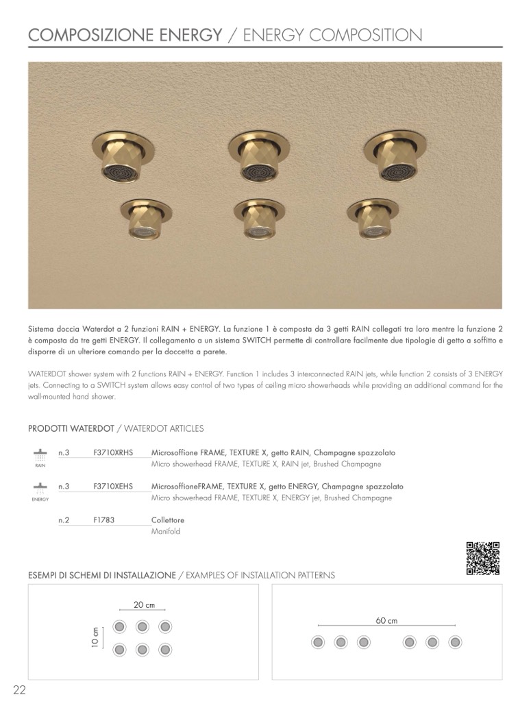 WATERDOT shower system with 2 functions RAIN + ENERGY. Function 1 includes 3 interconnected RAIN jets, while function 2 consists of 3 ENERGY