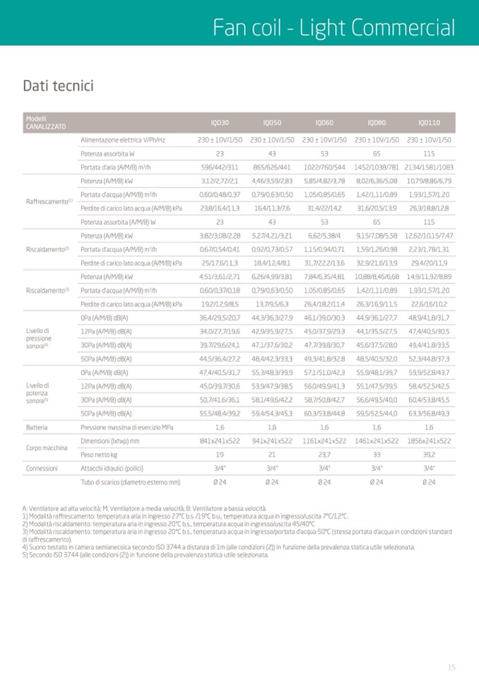 1) Modalità raffrescamento: temperatura aria in ingresso 27°C b.s. /19°C b.u., temperatura acqua in ingresso/uscita 7°C/12°C.