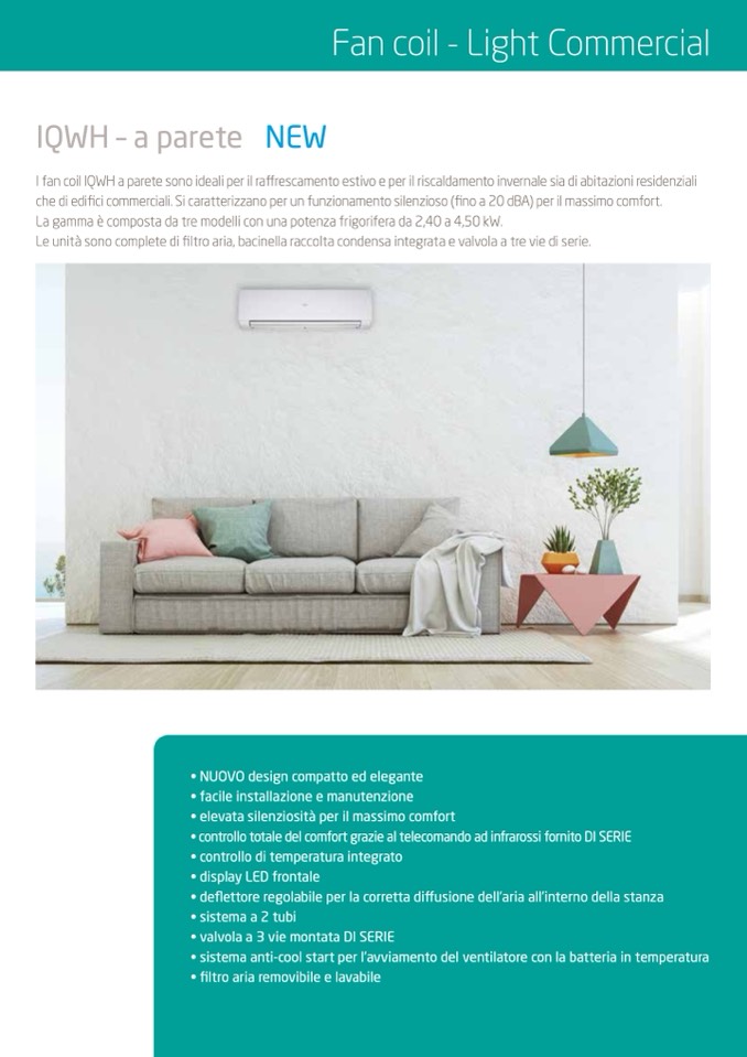 I fan coil IQWH a parete sono ideali per il raffrescamento estivo e per il riscaldamento invernale sia di abitazioni residenziali