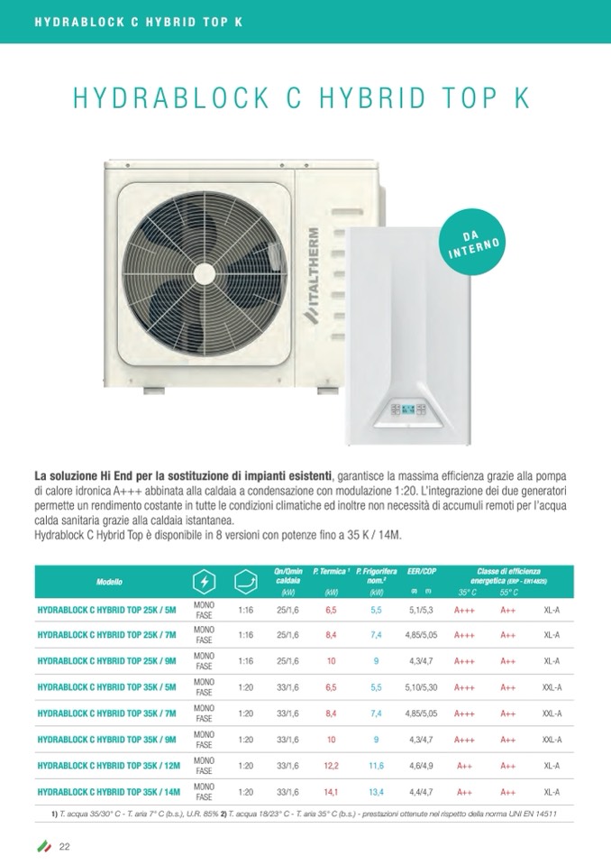 1) T. acqua 35/30° C - T. aria 7° C (b.s.), U.R. 85% 2) T. acqua 18/23° C - T. aria 35° C (b.s.) - prestazioni ottenute nel rispetto della norma UNI EN 14511