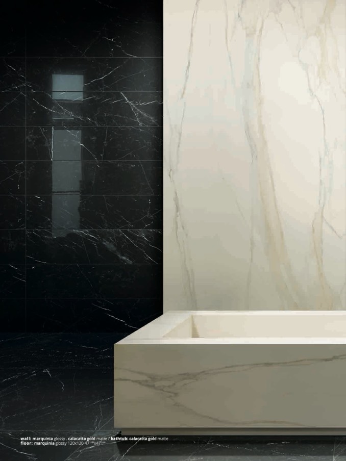 wall: marquinia glossy . calacatta gold matte / bathtub: calacatta gold matte