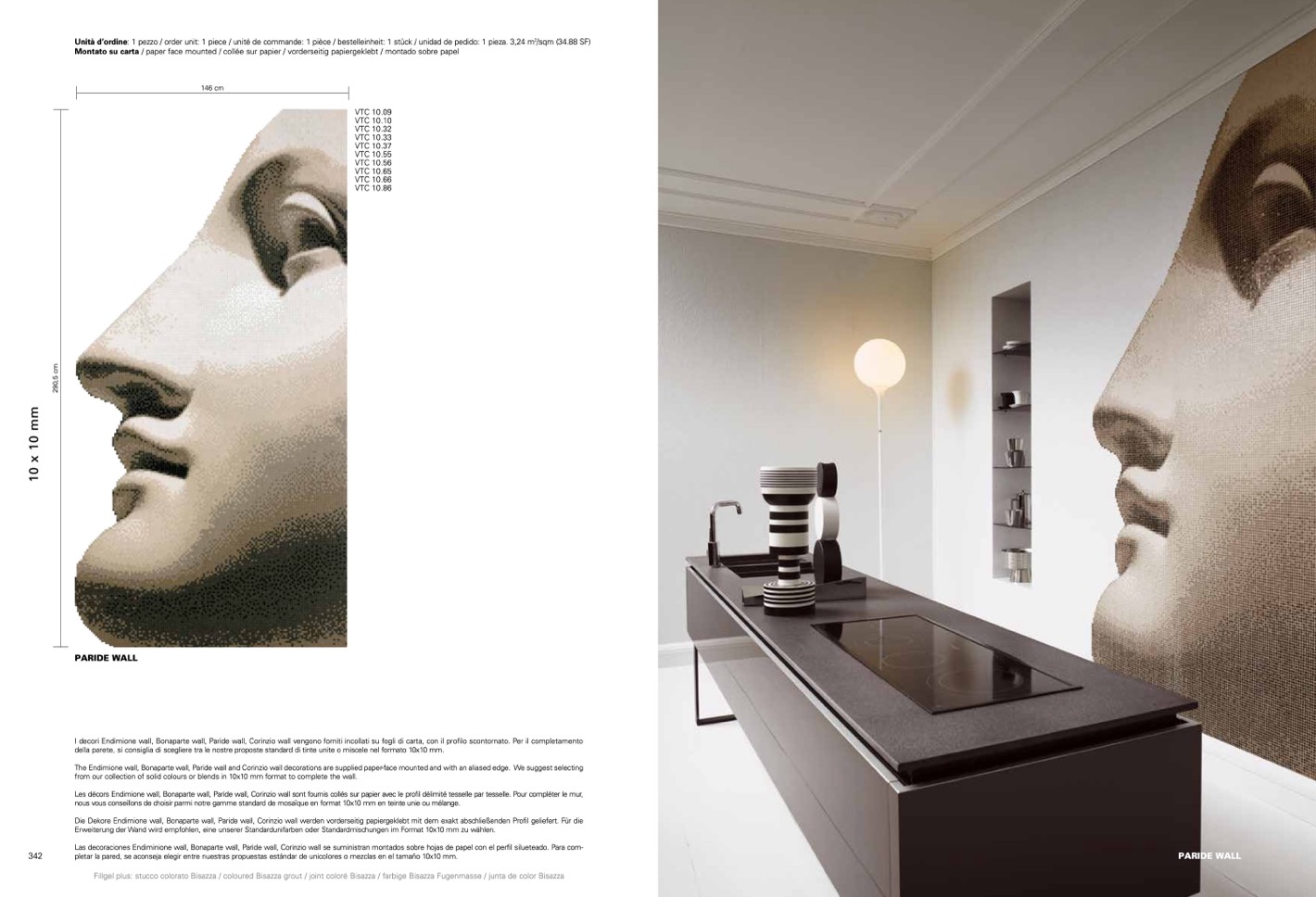 Les décors Endimione wall, Bonaparte wall, Paride wall, Corinzio wall sont fournis collés sur papier avec le profil délimité tesselle par tesselle. Pour compléter le mur,