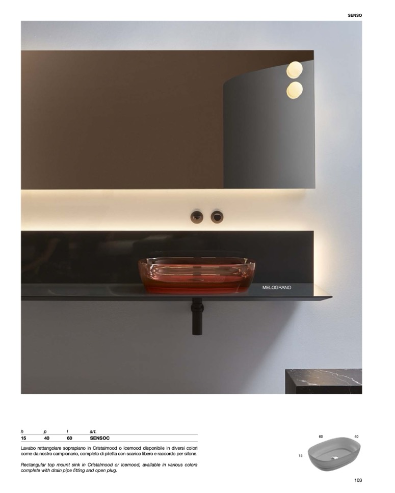 Lavabo rettangolare soprapiano in Cristalmood o Icemood disponibile in diversi colori