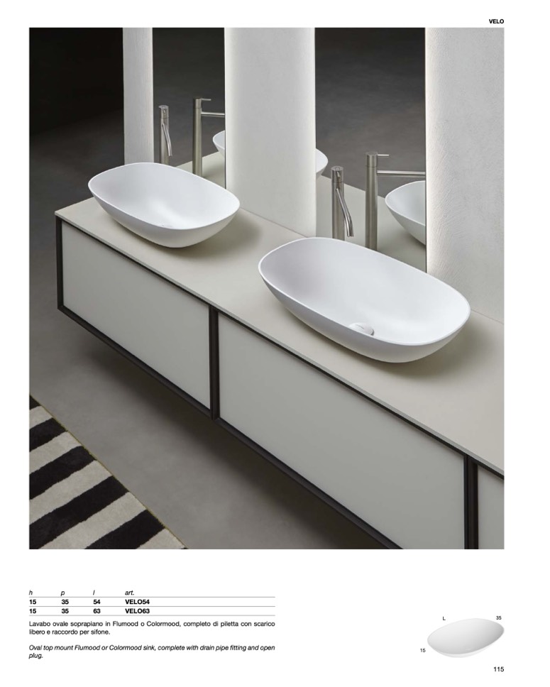 Lavabo ovale soprapiano in Flumood o Colormood, completo di piletta con scarico