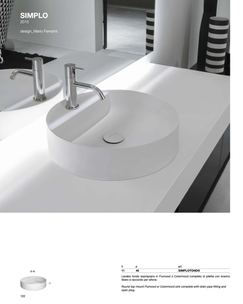 Lavabo tondo soprapiano in Flumood o Colormood completo di piletta con scarico