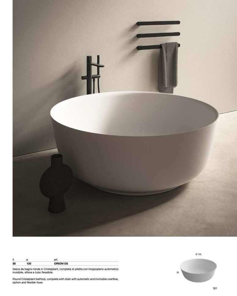 Vasca da bagno tonda in Cristalplant, completa di piletta con troppopieno automatico