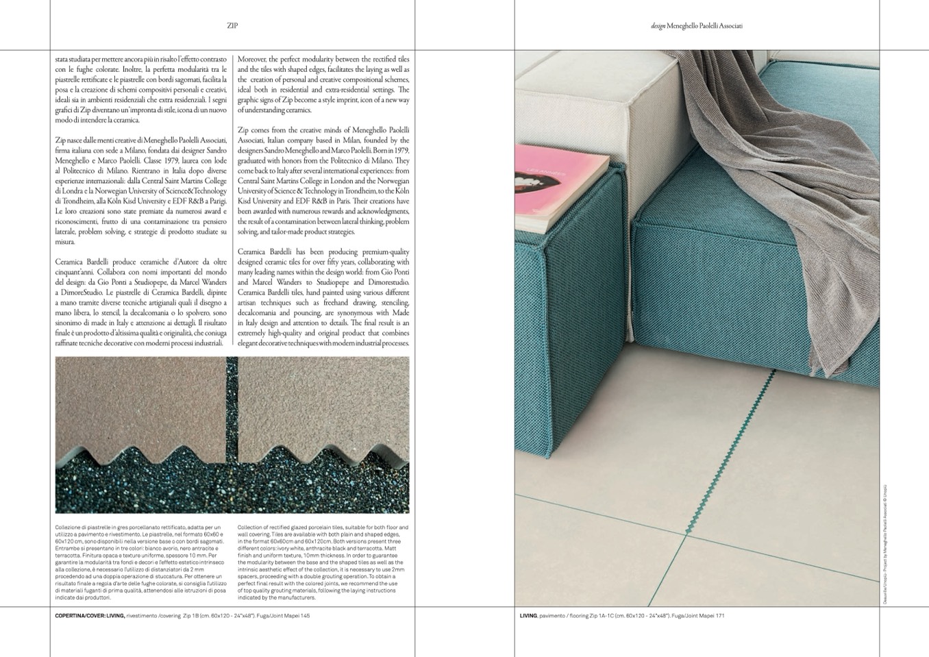 COPERTINA/COVER: LIVING, rivestimento /covering Zip 1B (cm. 60x120 - 24”x48”). Fuga/Joint Mapei 145