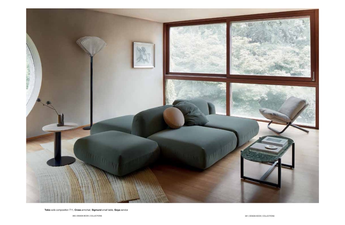 Tokio sofa composition T11, Cross armchair, Sigmund small table, Goya service