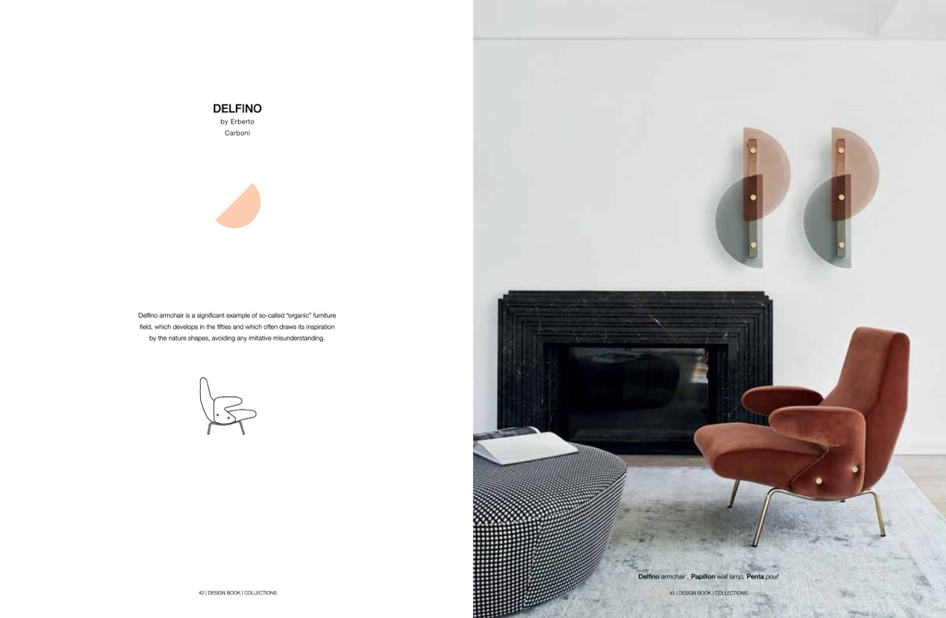 Delfino armchair , Papillon wall lamp, Penta pouf