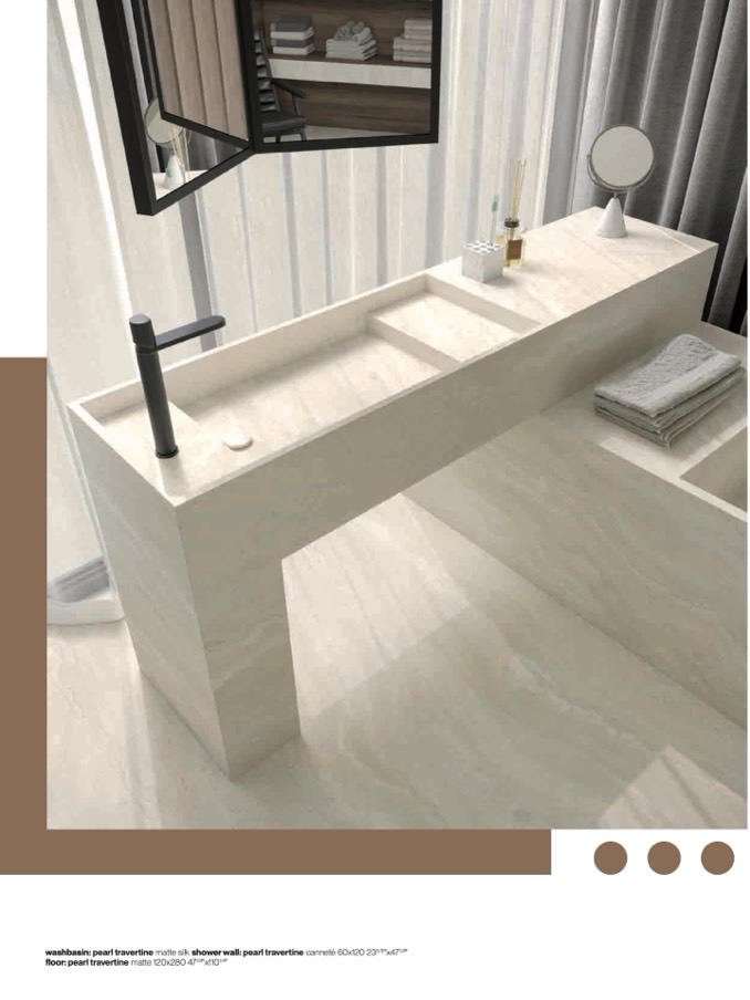 washbasin: pearl travertine matte silk shower wall: pearl travertine canneté 60x120 235/8"x471/4"