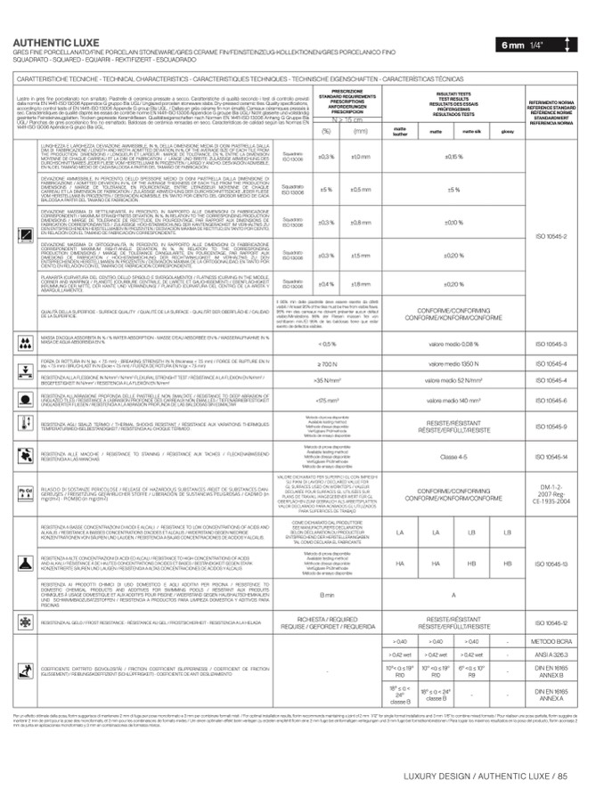 dalla norma EN 14411-ISO 13006 Appendice G gruppo BIa UGL/ Unglazed porcelain stoneware slabs. Dry-pressed ceramic tiles. Quality specifications,