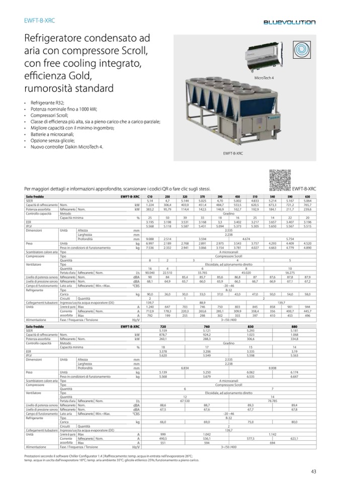temp. acqua in uscita dall'evaporatore 18°C; temp. aria ambiente 35°C; glicole etilenico 25%; funzionamento a pieno carico.